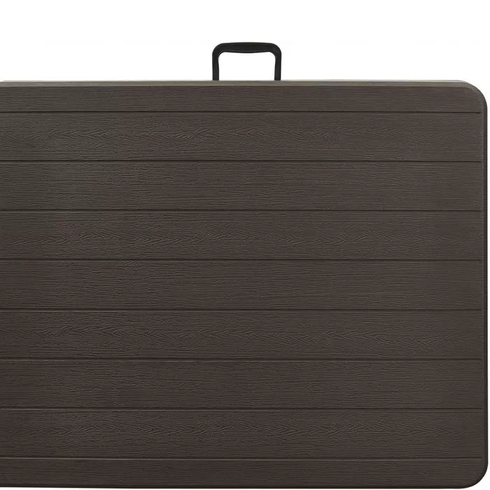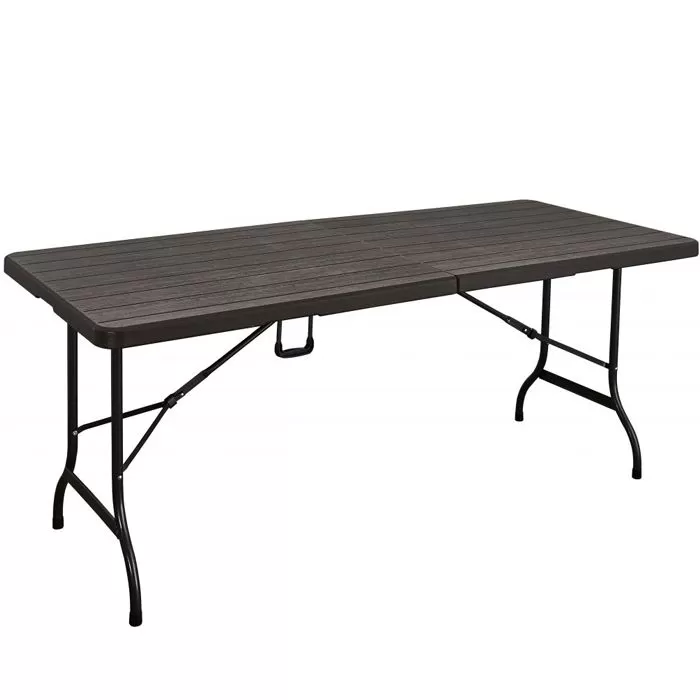 This sturdy, easy to clean, plastic table is ideal for catering tables and can be used indoor and outdoors. It has a realistic wood design which complements any outdoor area. The table has a folding feature which makes it easier to store away when not in use.