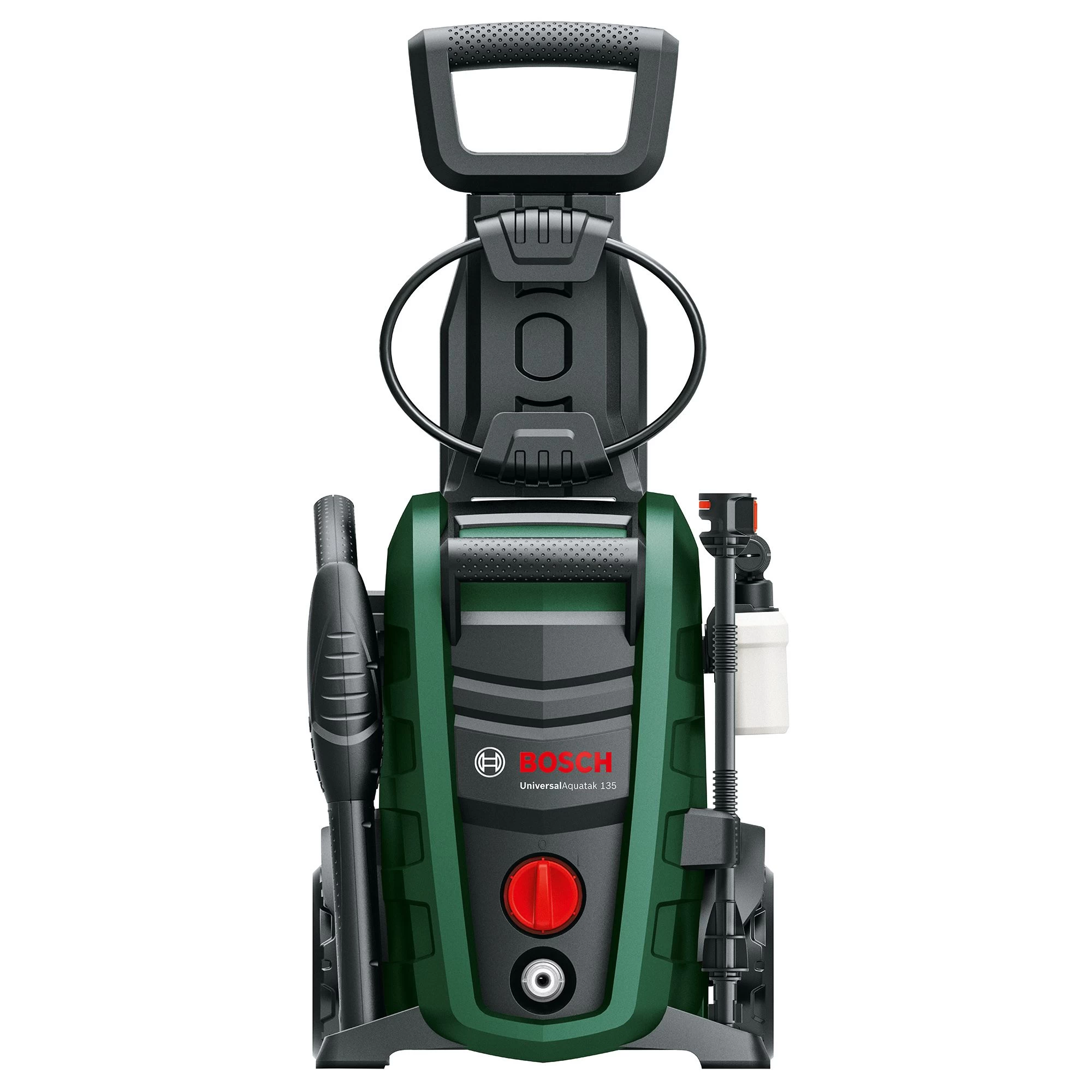 - Comes with Bosch UniversalAquatak 135, high pressure gun, lance, 5m high pressure hose, 3-in-1 nozzle, high pressure detergent nozzle, water filter
