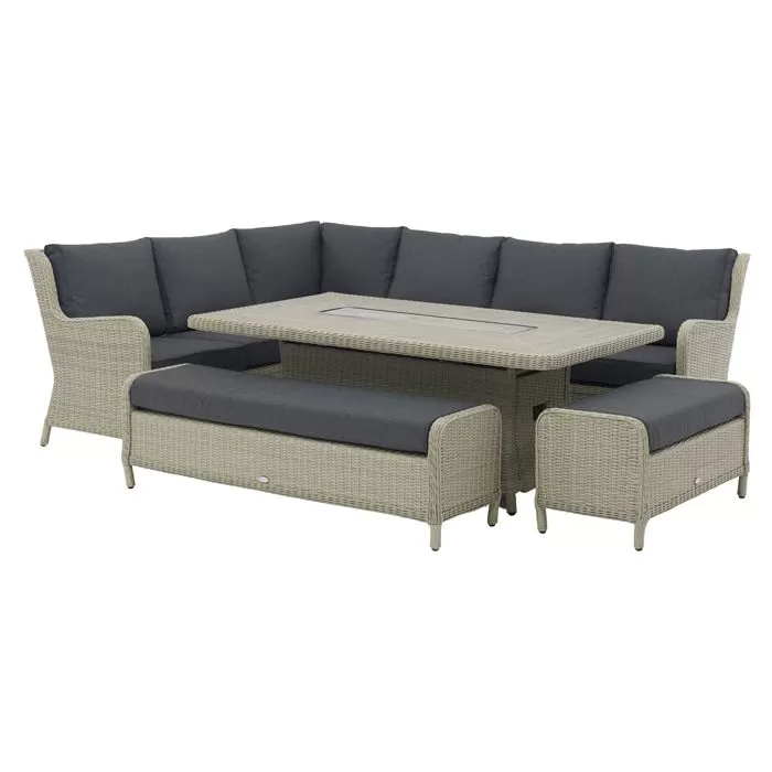 Large enough for 10 people to comfortably gather around, this set comprises a modular right corner sofa which features a high back for added comfort, as well as a long casual dining bench large enough to seat 3 people and a smaller 1 seater bench, perfectly accommodating the stunning rectangular ceramic dining table, all coming together to create a stunningly warm and relaxing atmosphere in your garden