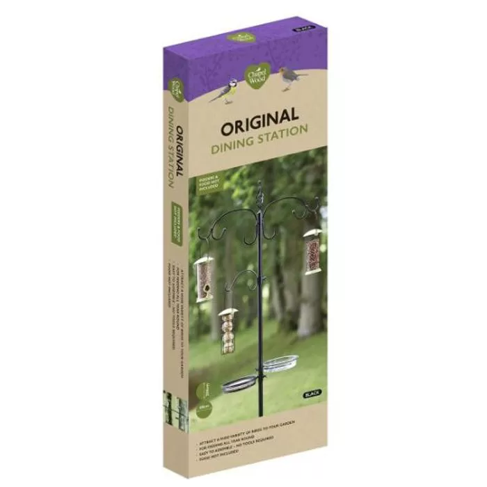 The original dining station by ChapelWood is perfect for attracting all kinds of wild birds to your garden for all year round feeding. Featuring two-way head hooks, one water dish, one mesh feeding tray and one adjustable feeding hook this dining station is perfect for feeding wild birds with a variety of different feeds and treats. Easy to assemble, this dining station is manufactured from high quality steel and requires no tools.