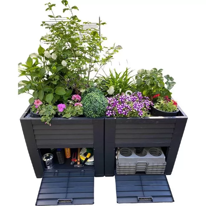 Gardening has never been easier, this double planting bed will allow you to plant your favourite flowers and grow fresh vegetables, herbs, and fruit. These raised tall planters prevent you from needing to bend over and prevent straining of the back. Underneath the planters are two storage spaces with separate openings making them perfect for storing gardening essentials such as pots, tools, and bags of soil.