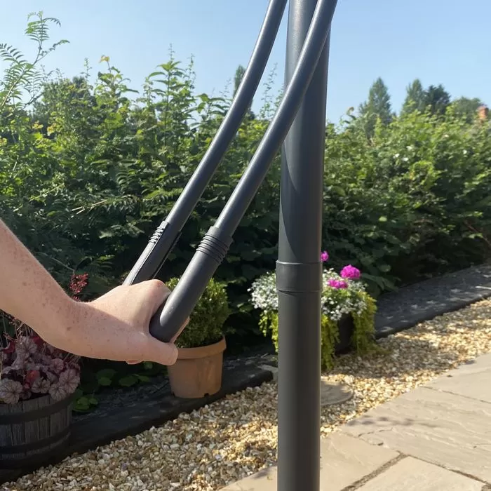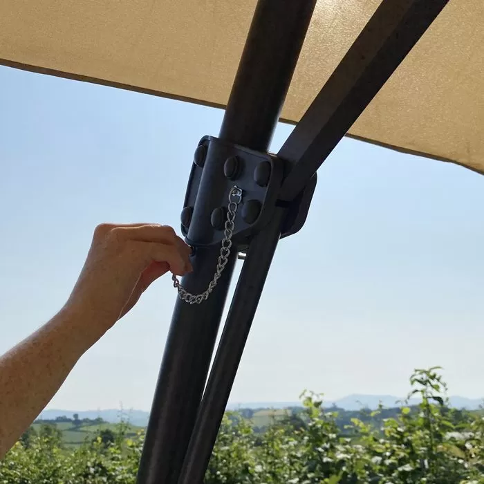 There’s no awkward stretching or heavy lifting with this parasol. To erect, all you have to do is pull down on the large lever mechanism and watch as the canopy rises and extends. Simply pop in the safety peg to secure and you’re ready to sit back and enjoy the outdoors without sunshine becoming a problem. When you’re finished with the parasol, you just remove the safety peg and push the lever down, the canopy will then come down and can be secured neatly with the built-in ties.