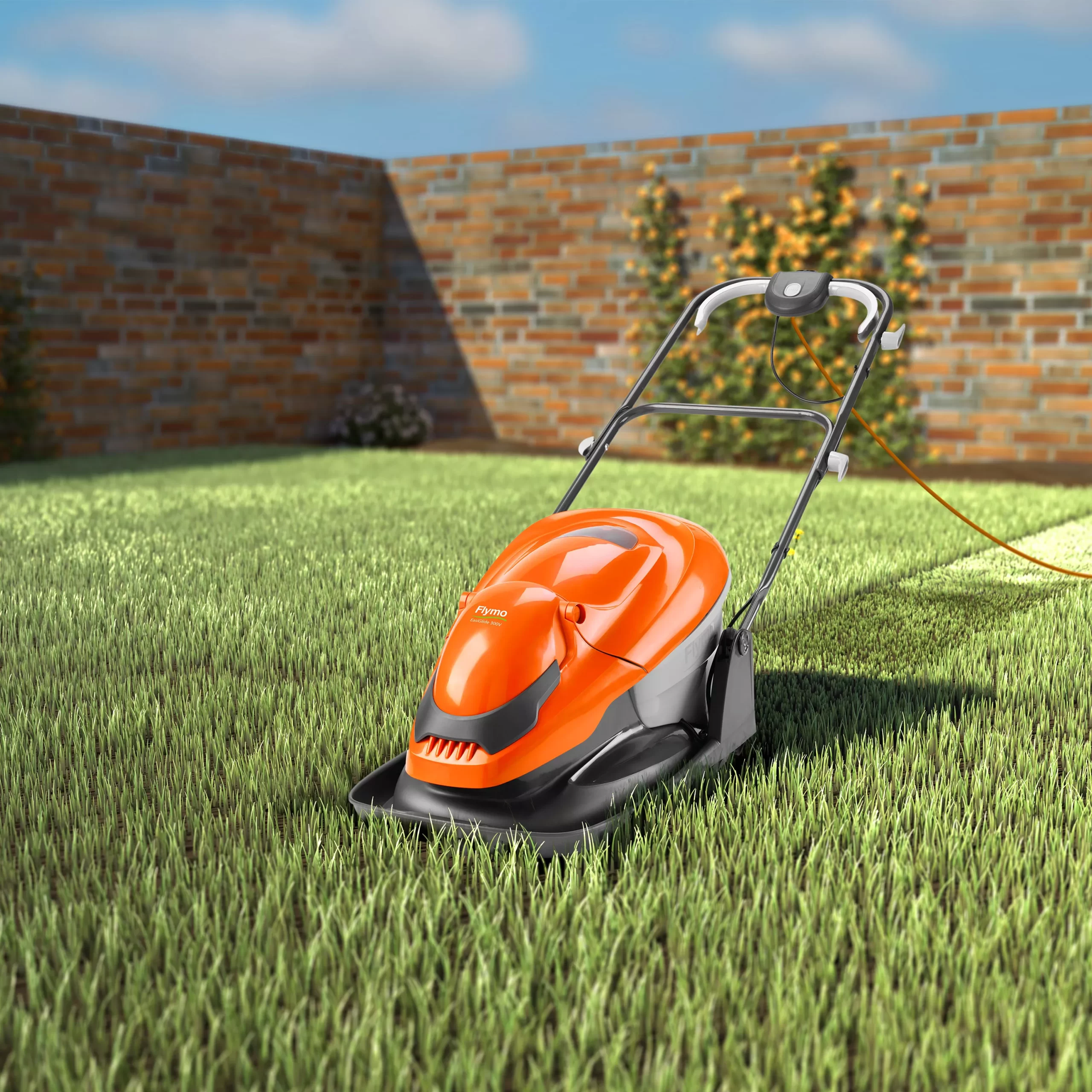 Electric hover collect lawnmower with convenient grass box vision window, cable storage and neatly folds away.