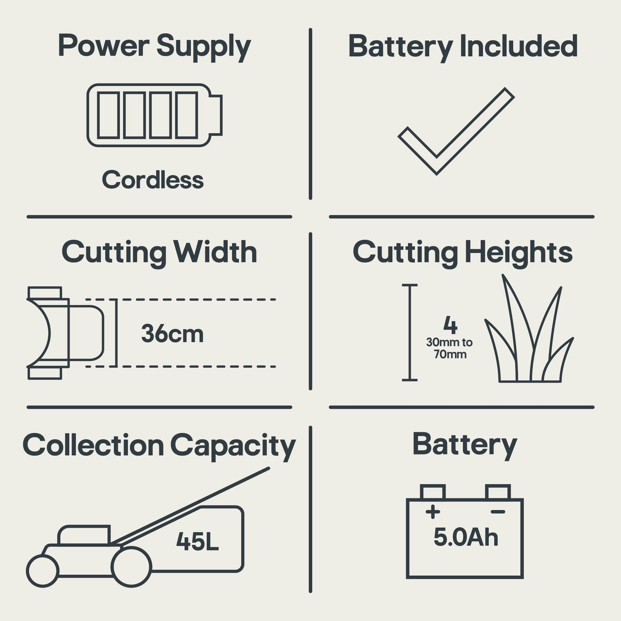 - The perfect cut every time – this mower’s 36cm cutting path gives you plenty of manoeuvrability for the perfect cut every time