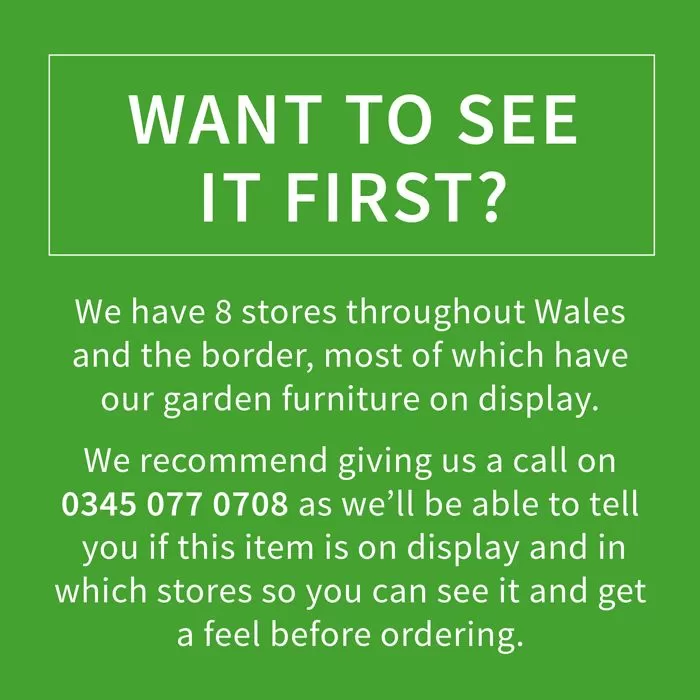 Want to see it first? We have 8 stores throughout Wales and the border, most of which have our garden furniture on display. We recommend giving us a call on 0345 077 0708 as we’ll be able to tell you if this item is on display and in which stores so you can see it and get a feel before ordering.