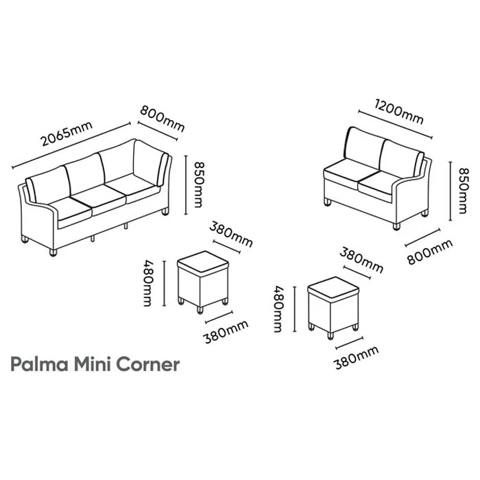 Ideal for both lounging and dining the corner seating area is complete with a modular table and two small stools which can also double up as a footrest after a long day. Made for easy maintenance, ultimate durability and comfort this Palma set has a strong powder coated aluminium frame that prevents rusting and is also super lightweight.