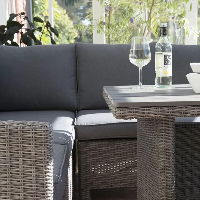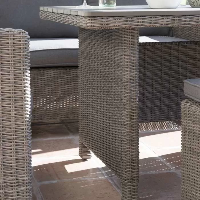 Complete your garden with the Kettler Palma Mini Corner Dining Set and create the perfect area for socialising with friends and dining with family in the summer sunshine. A traditional rattan design this natural wicker set can seat up to 7 of your guests comfortably thanks to the plush taupe cushions whilst also being conservative with your garden space.