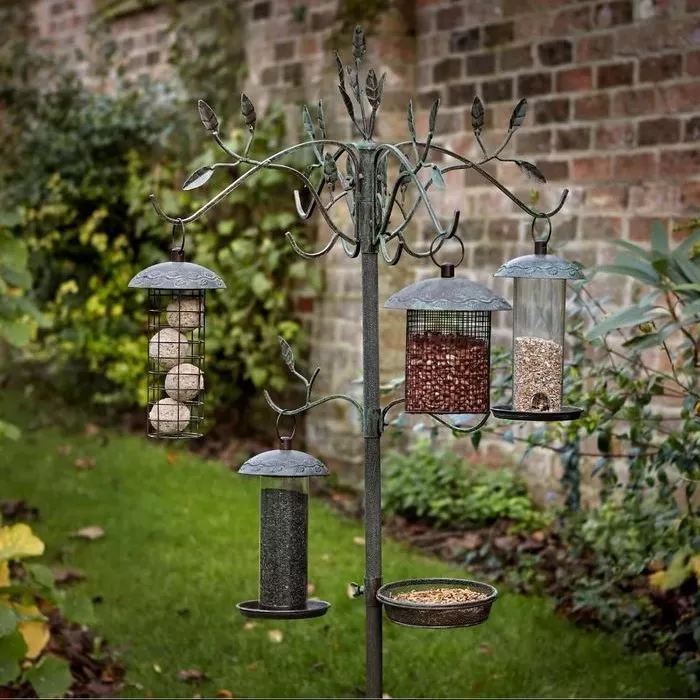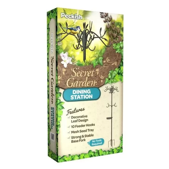 Invite a multitude of beautiful birds to your garden with this gorgeously designed Peckish Dining Station. The Secret Garden Station features intricate leaf designs with an incredible 10 feeding hooks built amongst them. With a rustic finish and strong, stable base fork, the majestic feeding station will look great as a feature in your garden. This bird feeding station requires no tools and comes with a mesh seed tray, perfect for mealworms.