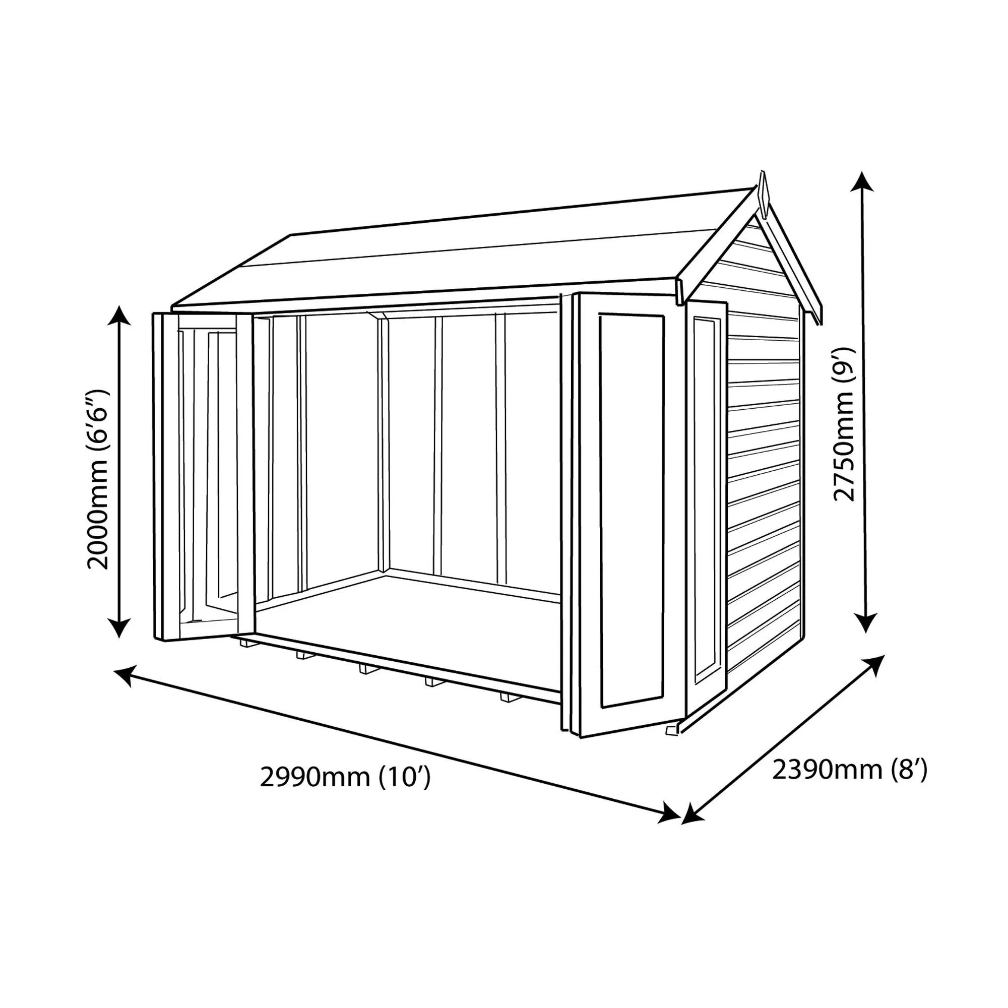 This Blenheim 10×8 summerhouse with felt roof tiles is perfect for use as a summerhouse, workshop or extra storage space. Assembly required.