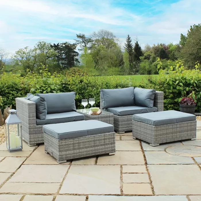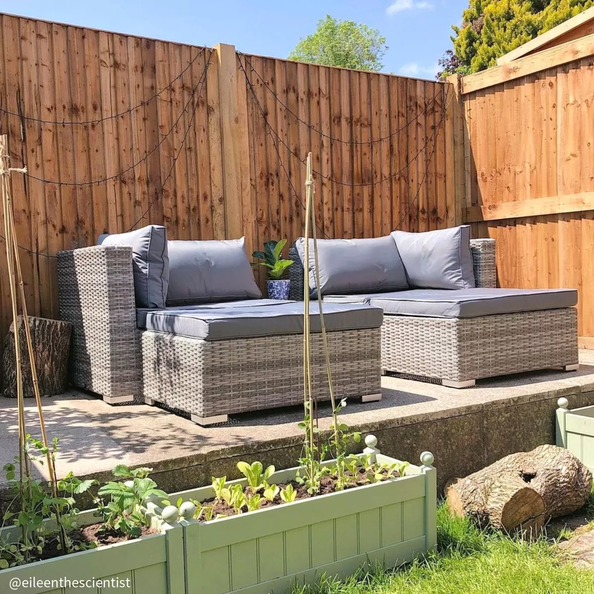 If you’re stuck between a lounger and seating arrangement, why not have both. Place both footstools infront of one chair to create a long lounger, then use the other chair and table for a comfortable seated set-up that’s perfect for reading or enjoying a cup of morning coffee.