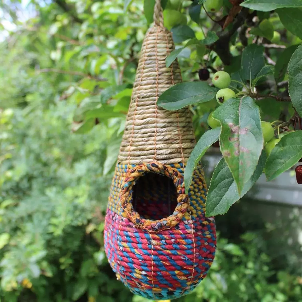 A content habitat for smaller birds, this natural woven bird nester is a great way to lend a helping hand to feathery folk especially in the winter months. Crafted from recycled saris to produce the colourful detailing, before being woven together with natural seagrass around a metal framework, each of these nesters has been made by skilled artisan women in Bangladesh to Fairtrade standards, making each nester extremely unique. Not only are they a stunning visual addition to your garden, they are also sturdy and robust enough to last the test of time under almost all conditions. Providing essential shelter and a place to roost for wild garden birds such as blue tits during the colder and wet autumn and winter months, they will also provide a safe place for nesting as spring rolls around.